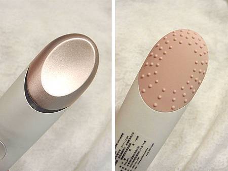 產品正面的金屬面會有溫度上的轉換,而背面的顆粒則可用來按摩